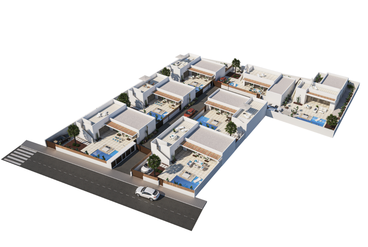Elke villa bestaat uit een ruime lichtrijke woonkamer met open keuken en toegang tot zuid-gericht terras en tuin met zwembad (20m2) en parking. Verder zijn er 3 slaapkamers waarvan 1 met en-suite badkamer, 2 badkamers en wasberging en solarium.